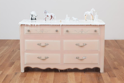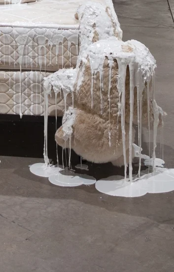All The Things I Might Have Humped, a site-specific installation, was featured in Jokes of Nature curated by Don Fodness and Geoffrey Shamos. This pieces explores childhood masturbation through the female lens. Stuffed animals, pillows, and bedding descend from the ceiling all drenched and coated in white plastic.