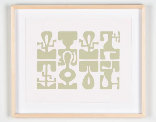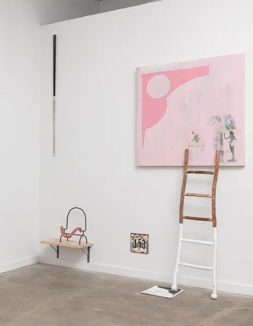 Steeped in the confines of domesticity, Amber Cobb’s biomorphic sculptures consider function and utility in their delightfully awkward attempts to hold space. Ranging from 5’9” to 13 inches tall, Cobb’s sculptures are scaled to the artist as adult and juvenile. Designed to personally accompany her, strategically placed limbs hold scarves and hats, a knee juts out to take a seat on, and a fleshy pocket serves as key receptacle. Opposite her sculptures are a series of gouache on paper paintings, that first appear as abstract hieroglyphs but represent English words coded in an illustrated typeface of the artist’s creation. Metaphorically referencing the difficulty and failings of language while locked in close quarters with one another, Cobb’s characters add new facets to the idea of body language.
